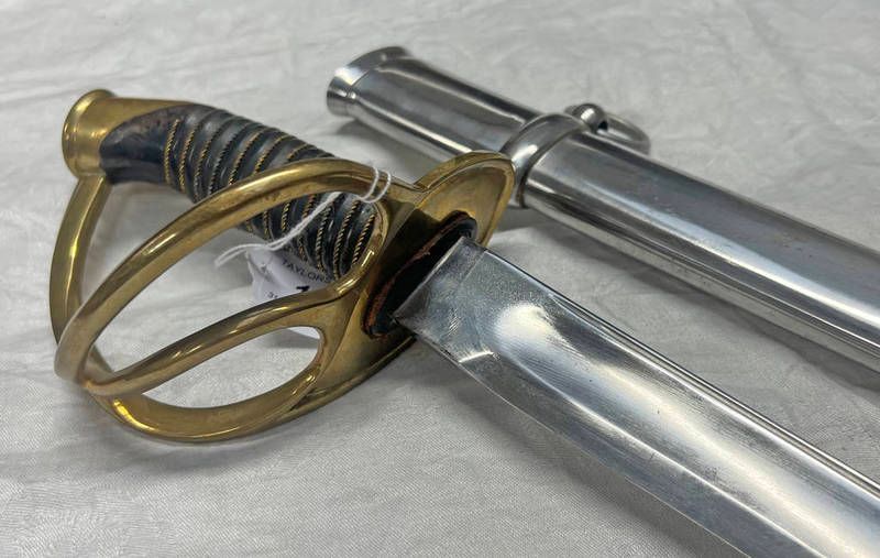 Reproduction french cavalry troopers sabre with 88cm long curved blade with double fuller, regulation 3 bar brass hilt, bound grip with its scabbard