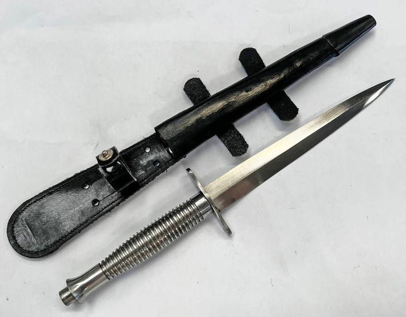 Interesting fs style fighting knife with 18.8cm long double edged blade, machine grip with it's leather & metal scabbard