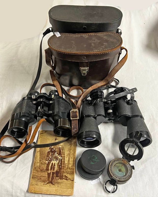 Ww2 1945 british military t g & co, marching compass, greenkat binoculars, ross 9 x 35 binoculars and milne and son, blairgowrie picture card of a piper