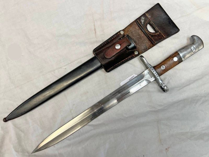 Swiss m57 bayonet with 24cm long blade with makers mark, characteristic grip, scabbard & leather...