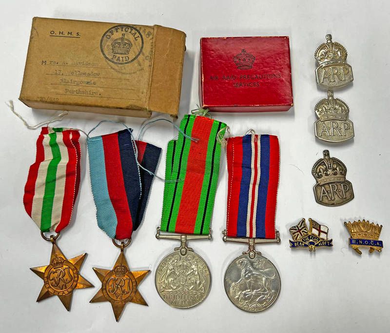 Ww2 medals italy star, 1939-45 star, defence and war medals along with silver arp and 2 other arp badges, rnoca badge and a pin badge with box addressed to davidson, blairgowrie