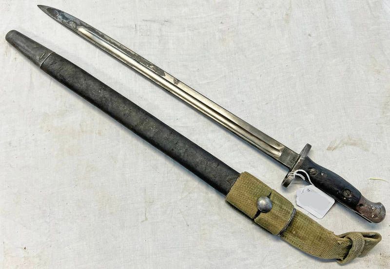 British 1907 pattern bayonet by sanderson with 42.8cm long blade dated 10, 16, with several other markings, characteristic grip with scabbard & canvas frog