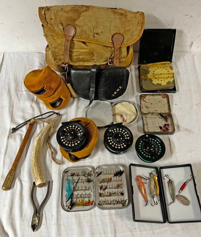 Fishing bag with scientific anglers reel & spool, richard wheatley fly tin, lures, priests, etc