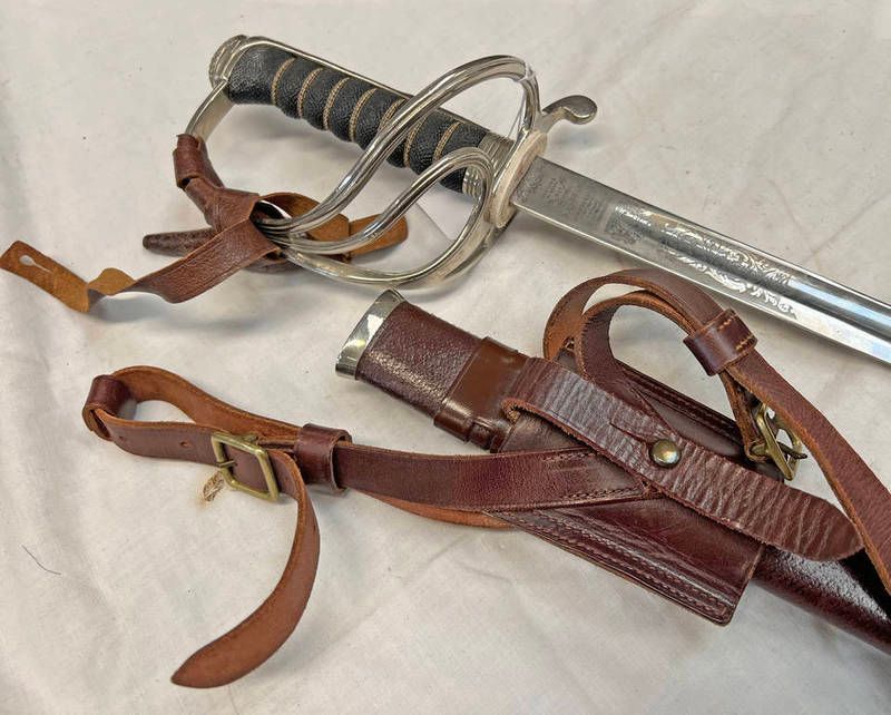 Elizabeth ii royal corps of transport officers sword with 86 cm long blade with wilkinson makers mark and corps badge and royal cypher, numbered 9?4555 with its characteristic bar hilt with bound grip and leather scabbard with leather frog.