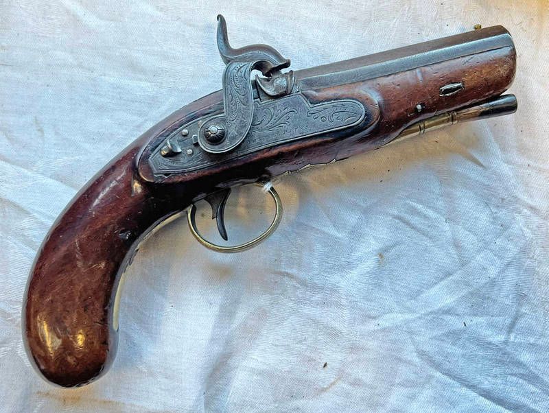32 bore percussion travelling pistol signed smythe davys london, 10.5cm long octagonal barrel engraved 'london' to top flat, signed flat lock engraved with scroll work, full stock with brass mounts and its ramrod