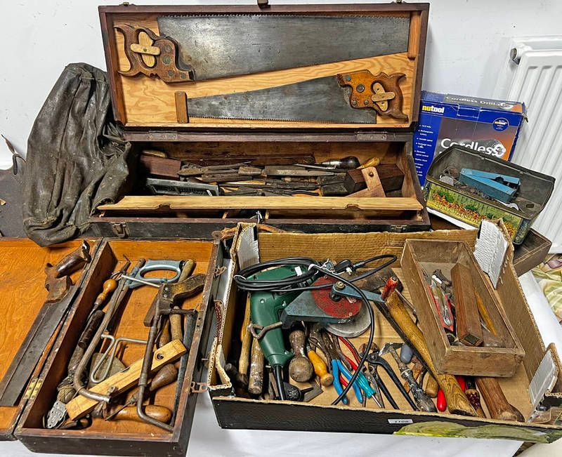 Vintage wood working tools to include disston saw, kangeroo saw, planes, hatchet, tool box, hammers, etc in 2 boxes