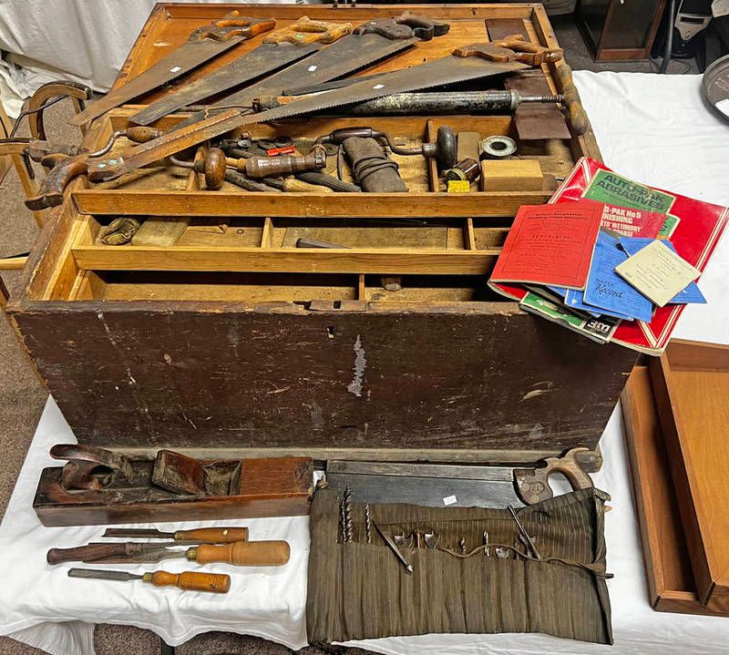 Large joiners tool box with contents of vintage tools to include kangaroo saws, braces, bits, screw drivers, etc