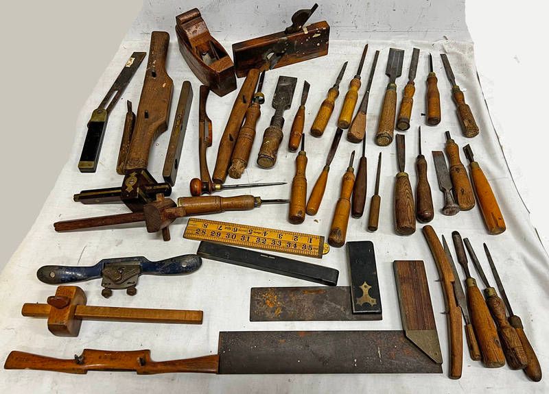 Vintage tools to include chisels, spoke shaves, levels, squares, etc in 1 box