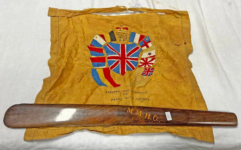Polished & shaped wooden club / page turner marked with the initials mmhg along with a ww1 embroidered cloth panel -2-