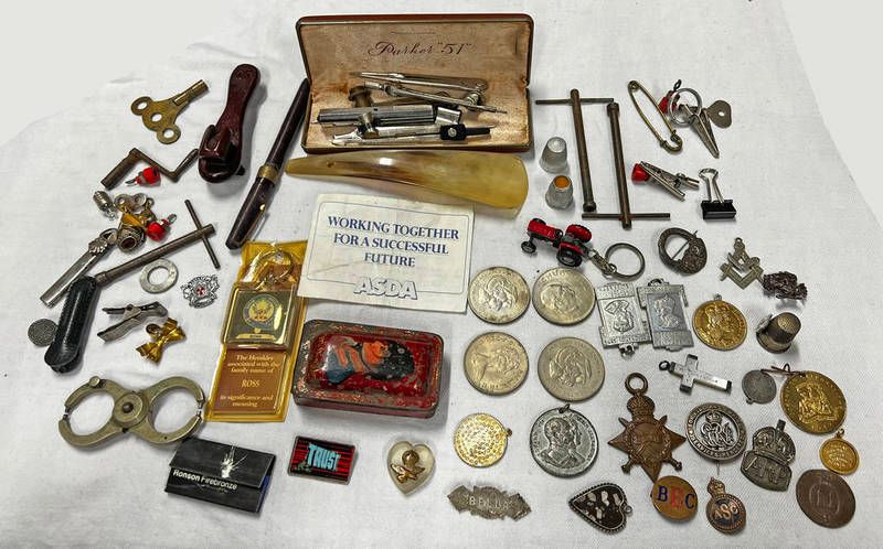 Ephemera to include ww1 1914-15 star medal awarded to 1600 pte. g thomson gordon highlanders, silver services rendered badge awarded to b164189, silver arp badge, hoxne suffolk half penny 1795, coronation medals, churchill crown etc