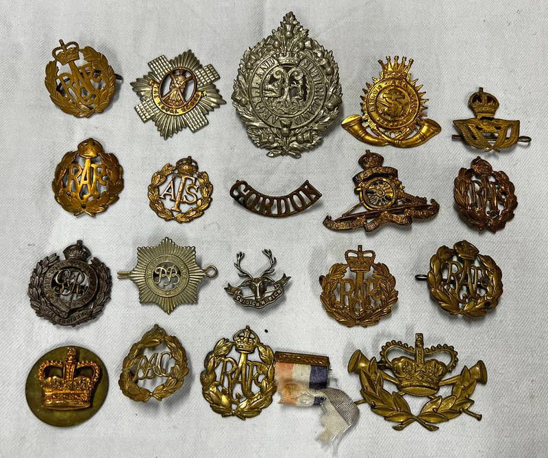 Military cap badges to include a silver seaforth highlanders brooch, raf, royal scots, gordon shoulder title, rac, ats, argyll & sutherland highlanders, etc