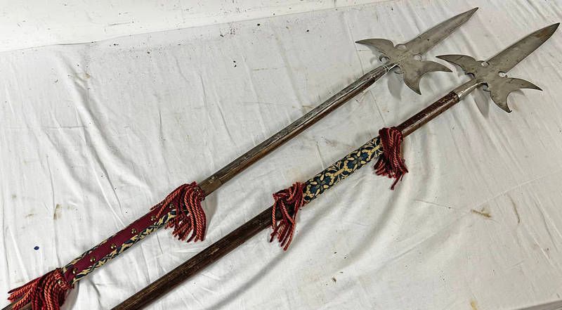 Pair of 18th century style halberds both with crescentic blades, with beak shape flute and...