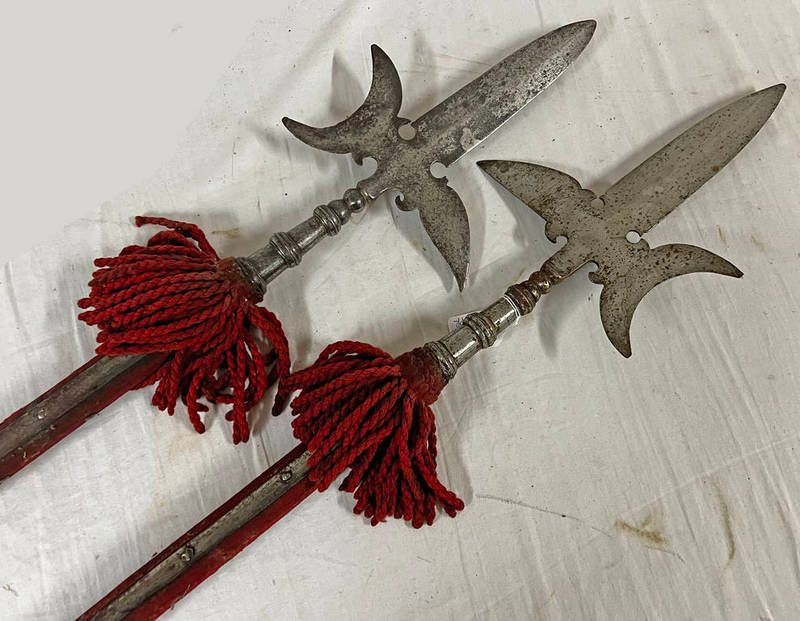 Pair of german halberds with crescent shaped blades of traditional form, with triple turned knops with mounts, with long straps covered in red velvet, octagonal hafts with tassel tops, 219cm long