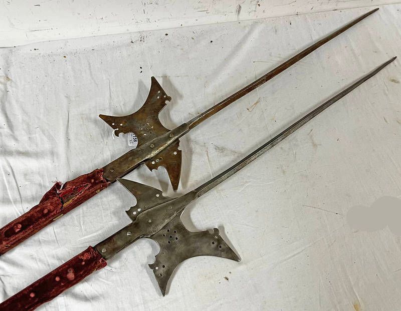 Pair of 18th century style halberds both with crescentic blades, with beak shape flute and...