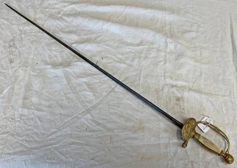 French naval officers sword with 83 cm blade of triangular form, brass hilt with traces of engraving, pommel and guard with fouled anchor, mother of pearl grip with hand guard.