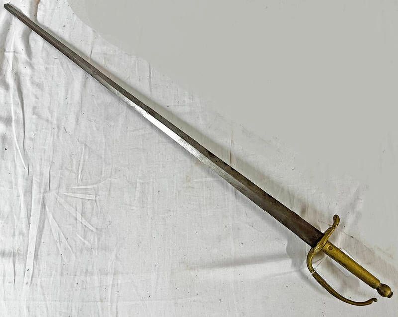 Interesting sword shaped fire poker with 81cm long thick blade with fat pointed tip & a brass hilt