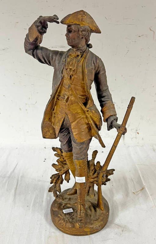 19th century french spelter figure of a hunter, figure is of a louis xv soldier holding a gun in his left hand while scanning the horizon, 40cm tall
