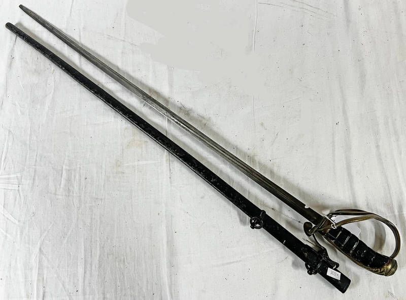 19th century whites of london sword with 70cm long blade with partial double fuller, makers name to blade, brass hilt with its scabbard with locking mechanism