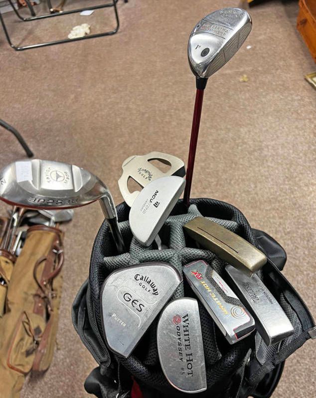 Golf clubs - putters to include ping anser, white hot rx, white hot odyssey #5, longridge golf, etc & a callaway big bertha heaven wood 14 degree, taylor made rescue 21 degree in a hippo golf bag