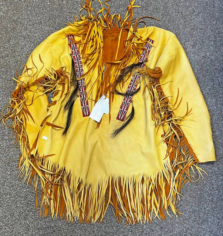 Buffalo hogen beaded waistshirt, artist gillian romero, tribal affiliation laguna with label