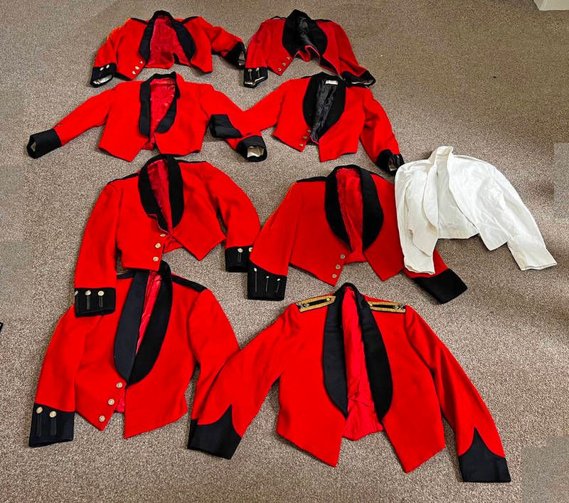 6 red mess jackets with kosb (kings own scottish borders) buttons, red mess jacket with parachute bullion patch to cuff and one other -8-