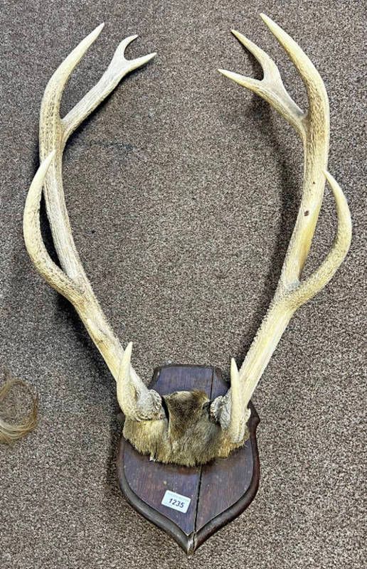 12 point antlers on skull on shield marked hw1970 & 1 other set of antlers...
