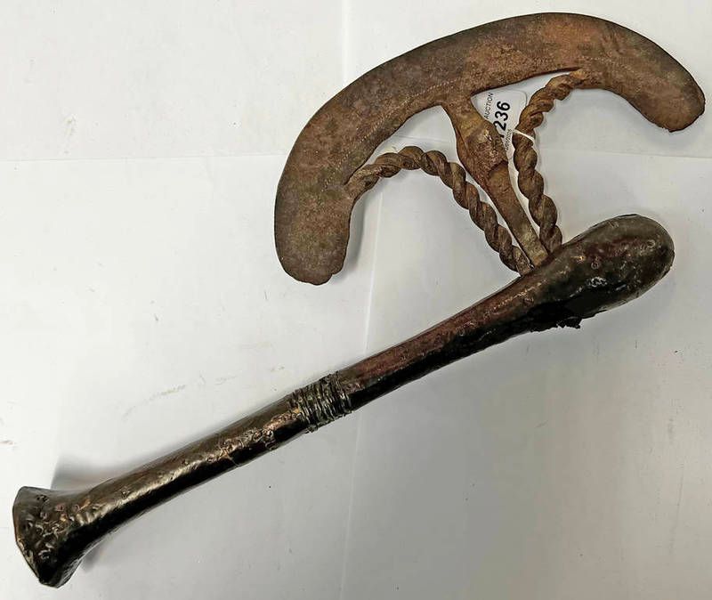 Songye axe, the metal blade with 2 heads & twist decoration, with riveted sheet copper covered handle, 42cm long