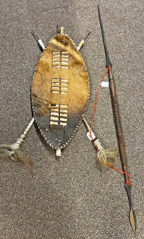 Hide tribal hand shield 53cm across and a spear
