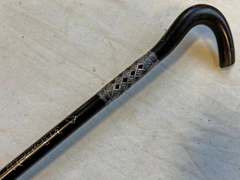 White metal inlaid walking stick, the body inset & banded 98cm long