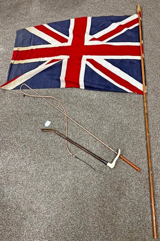 Vintage union jack flag on pole, riding crop & a horse whip -3-