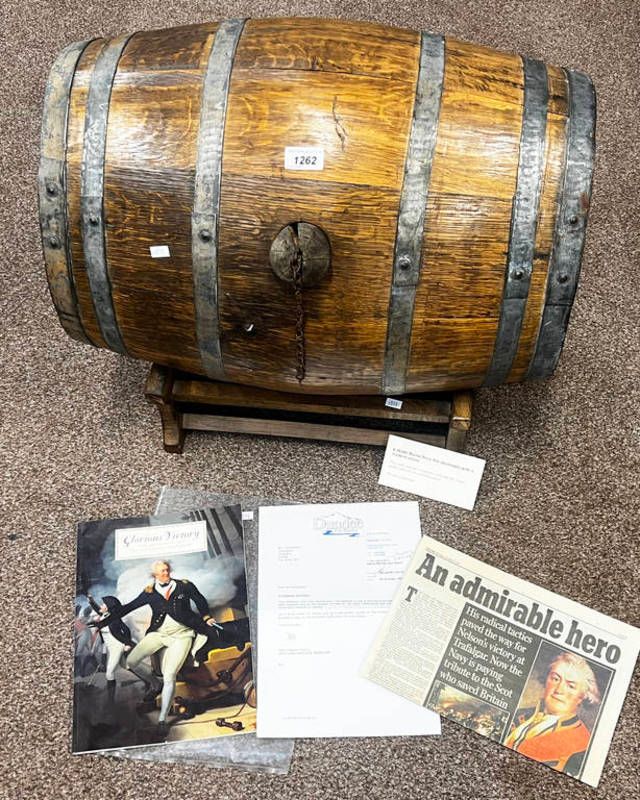 Oak water barrel on later stand, by repute - from the venerable & previously on display in the glorious victory exhibition, hms venerable (1784) served as admirals duncans flag ship at the battle of camperdown, 58.5cm across