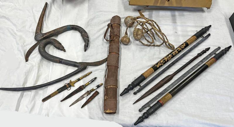 Tribal / ethnic weapons to include 3 small daggers with sheaths, bound hide bolo, 2 sickles, etc