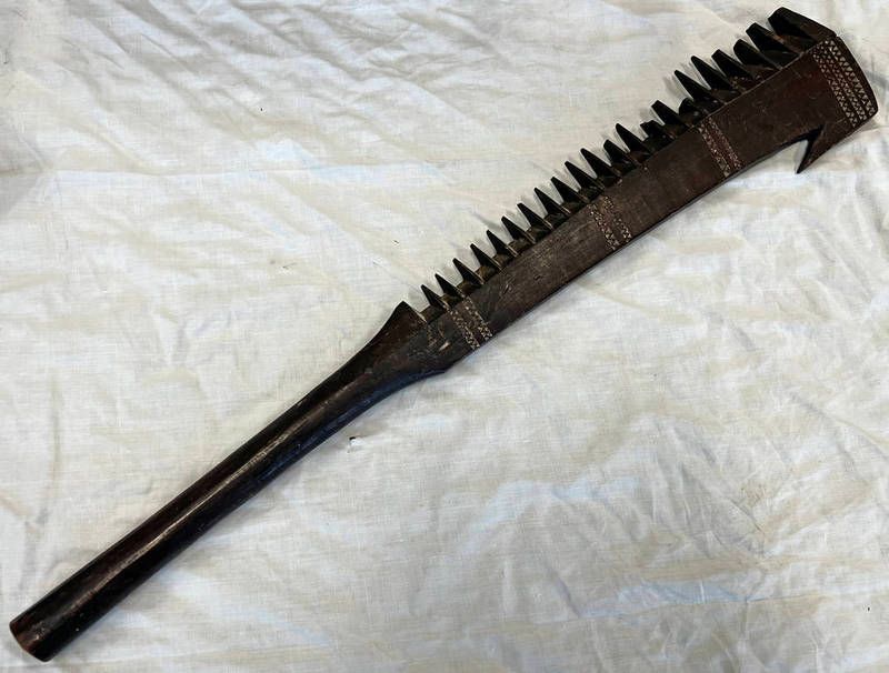 Samoa club, polynesia, carved with hooked top & spiked edge, with zig zag bands with remains of lime fill, 74cm long