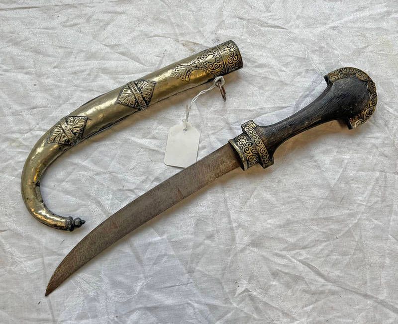 North african jambiya with 22cm long curved double edged blade, characteristic brass and white metal...