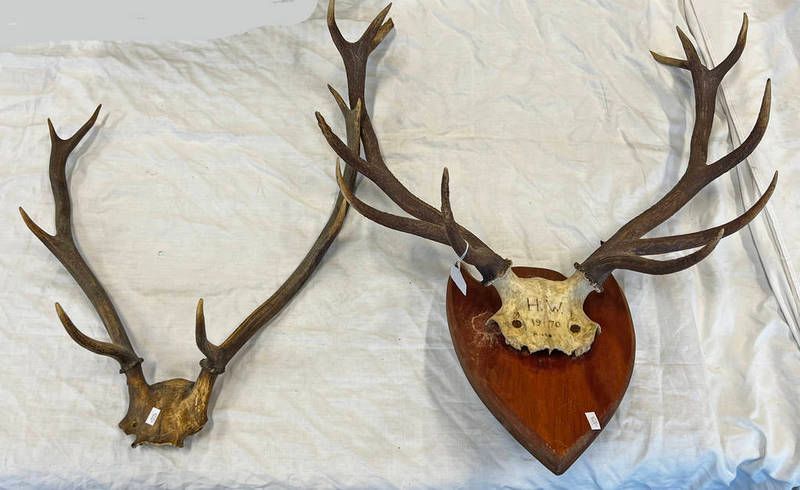 12 point antlers on skull on shield marked hw1970 & 1 other set of antlers -2-