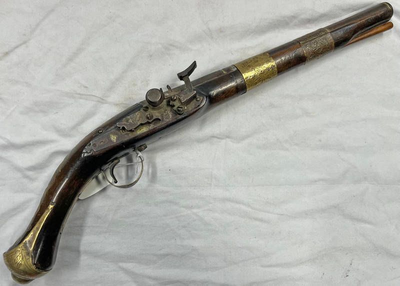 18 bore north african snaphaunce pistol with 30.8cm long two stage barrel engraved inlaid brass and white metal panels, brass inlaid stock, stamped lock plate, brass mounts and wood ramrod