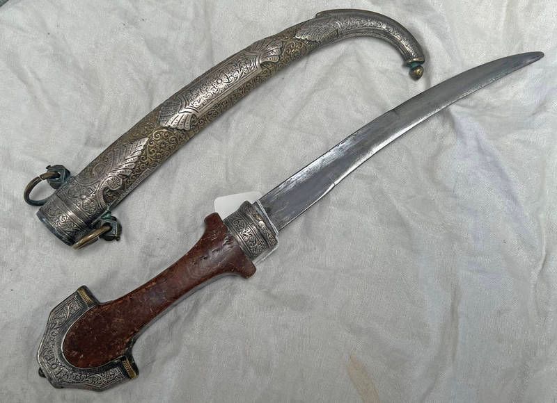 Moroccan jambiya with 22.4cm long slightly curved blade, white metal collar and pommel to hilt...
