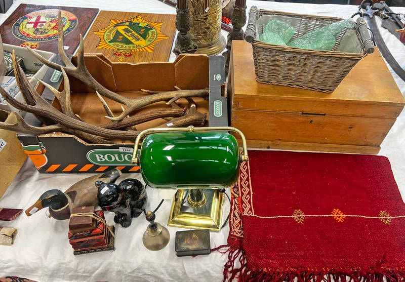 Antlers, bankers lamp, wicker basket, carved wooden toy duck with wheels, sylvac cat, a middle eastern rug, miniature books to include childe harolds pilgrimage, biblical gem etc