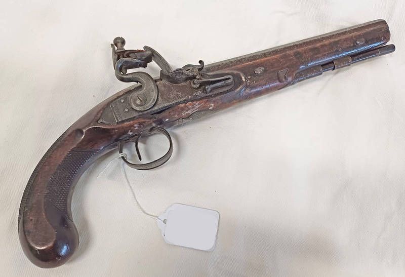 24 bore flintlock holster pistol with indistinct signature to lock, 21.5 cm long barrel full stock with ramrod and chequered panels to grip
