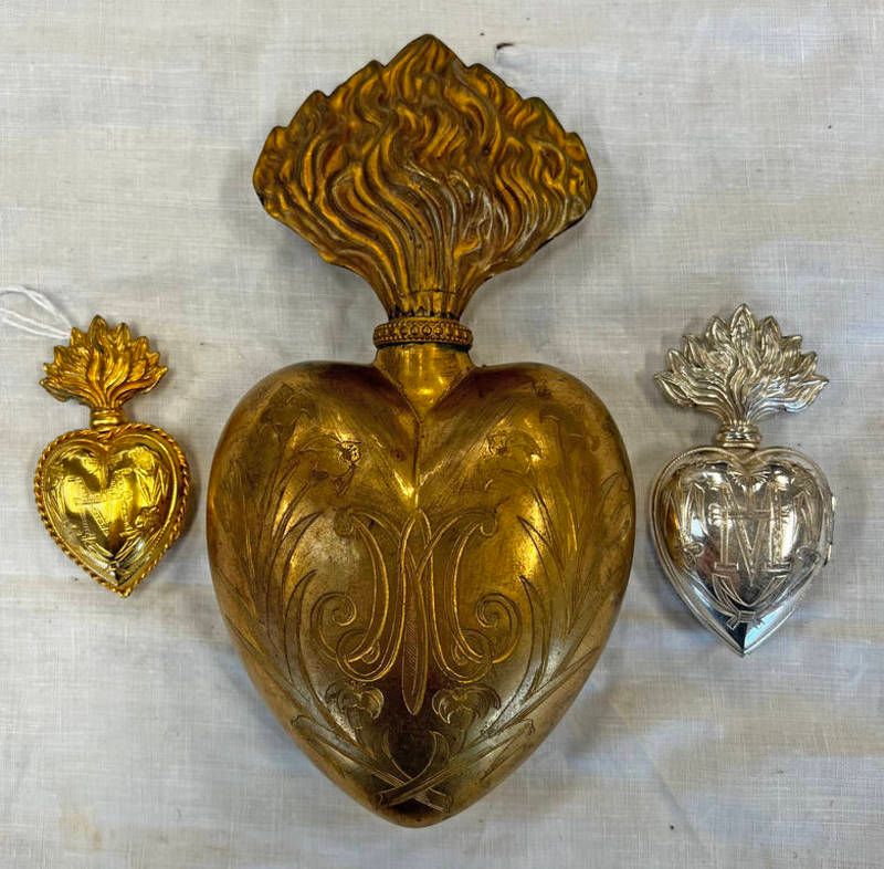 19th century brass reliquary ex voto religious heart of devotion & 2 other smaller examples, 1 etched with fouled anchor, largest is 18cm -3-