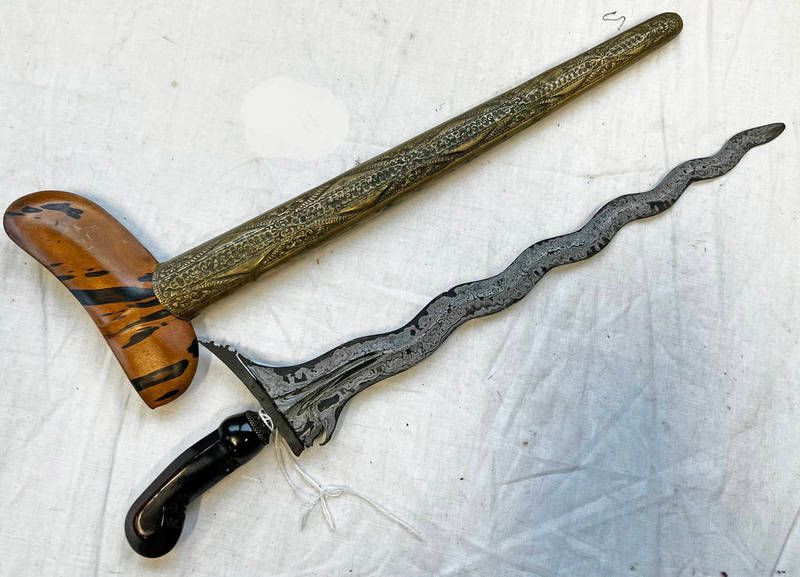 Kris with 34cm long wavy blade with wooden handle & its characteristic hilt