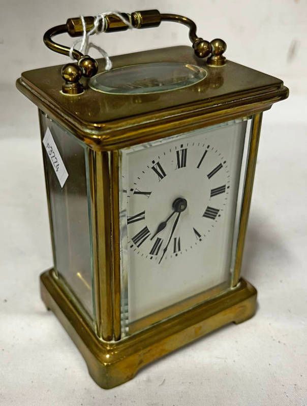 Late 19th century or early 20th century gilt carriage clock with roman numerals to dial, 12cm tall