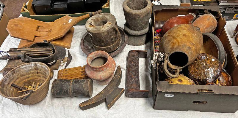 Ethnic and tribal gourds of various compositions to include an animal hide bodies, example with cowie shell tassels, carved wooden lidded pot etc.