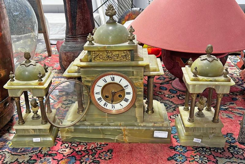 Late 19th century or early 20th century 3 pce green hardstone clock garniture (af), 39cm tall