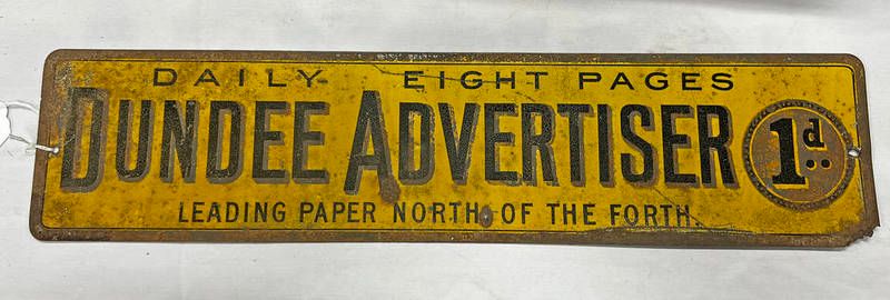 Metal advertisement sign 'daily eight pages dundee advertiser leading paper north of the forth', 49.5cm long
