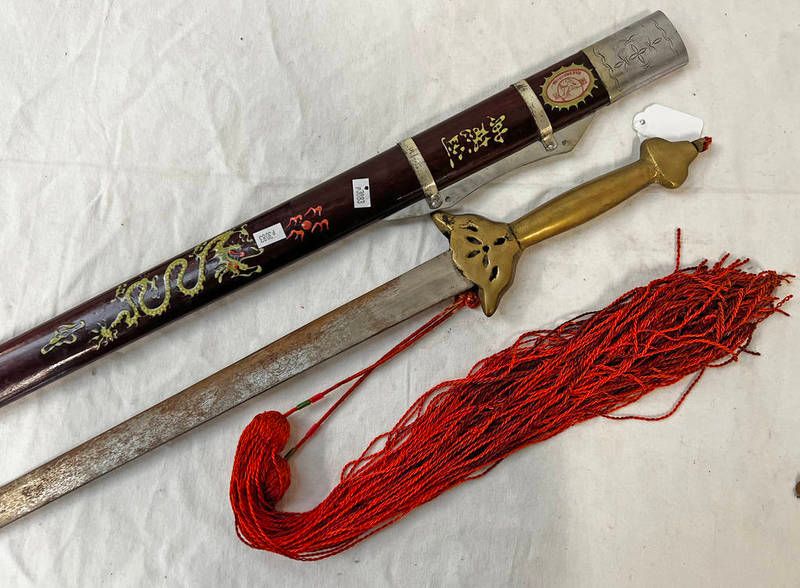 Ornamental oriental sword with wood & metal scabbard decorated with dragons, etc