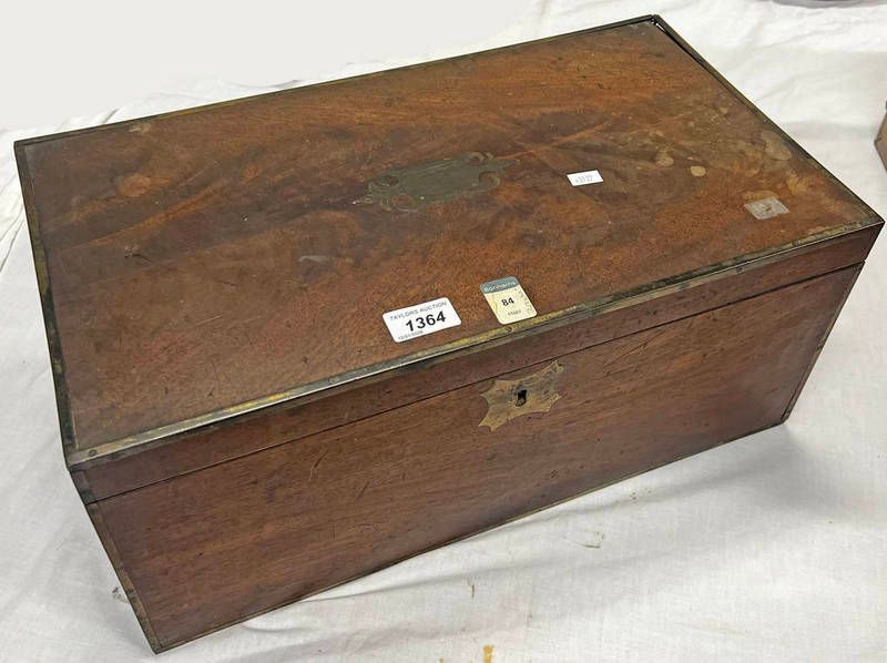 A regency mahogany and brass bound box, with brass escutcheon and inset side handles, the interior fitted with removable compartments, 48cm wide