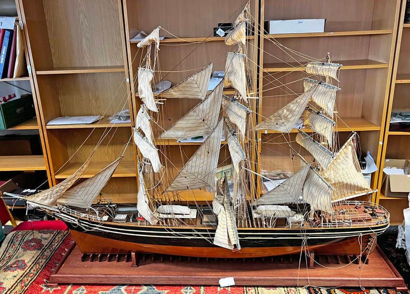 Cutty sark sailing ship model on wooden base, 106 cm long