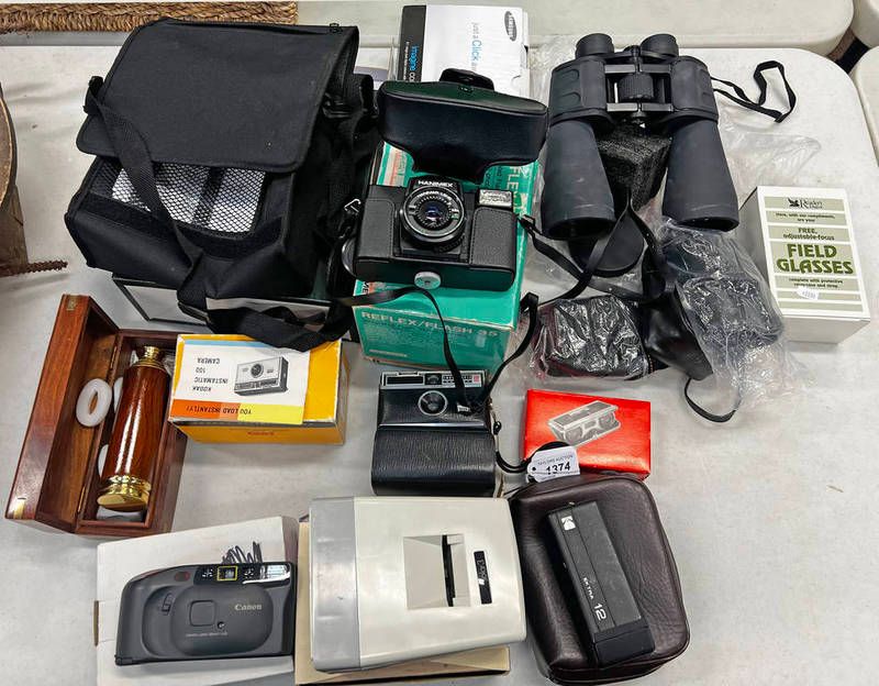 20 x 50 binoculars with carry pouch and box, kodak ektra 12 camera, canon sure shot ex, 3 draw telescope, instamatic 100 camera, reflex flash 35 camera in box etc