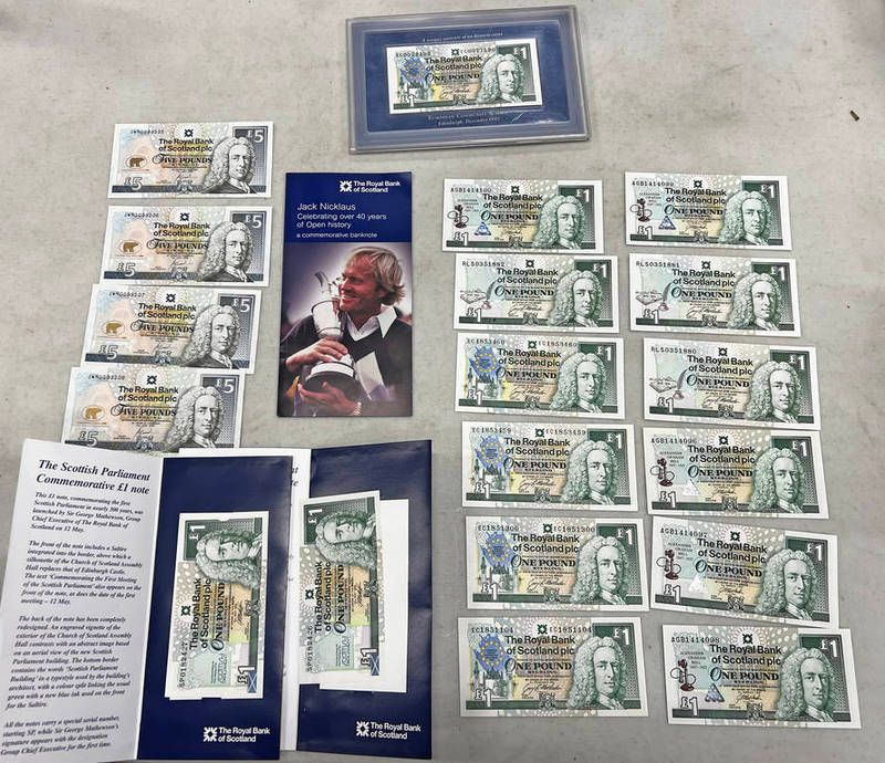 British bank notes to include 4 consecutive royal bank of scotland jack nicklaus �5 notes jwn0093205 - 08, royal bank of scotland �1 notes to include 5 consecutive notes agb1414096-100, 3 x rls0351880-882, mounted example etc